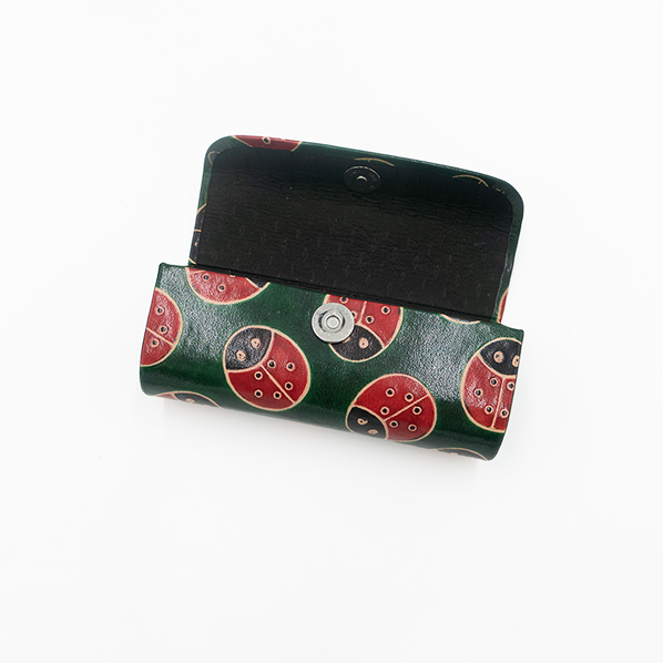 Handgemaakte groene leren brillenkoker uit India met lieveheersbeestjes. Een stijlvolle brillenkoker van geitenleer om je bril veilig op te bergen en gemakkelijk mee te nemen.