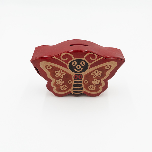 Deze leren vlinder spaarpot is gemaakt van geitenleer en heeft een gleuf aan de bovenzijde om geld in te stoppen. Aan de zijkant zit een drukker, zodat je de spaarpot eenvoudig kunt openen om het geld eruit te halen.